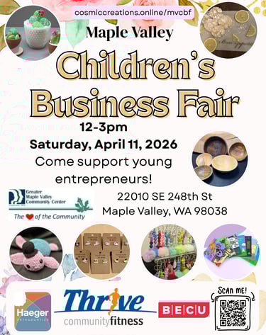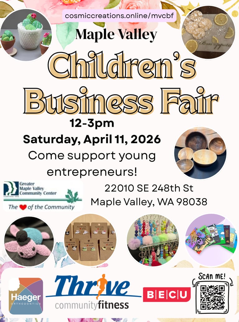 The Maple Valley Children's Business Fair (MVCBF), is a huge opportunity for kids ages 8-15 to learn about starting a business in a safe, low risk environment. Participating will help the young entrepreneurs learn about the basics of creating a business plan, advertising and selling their products or services for real money. The MVCBF is a gateway to the world of business and will allow learning through a hands on experience compared to a classroom environment.